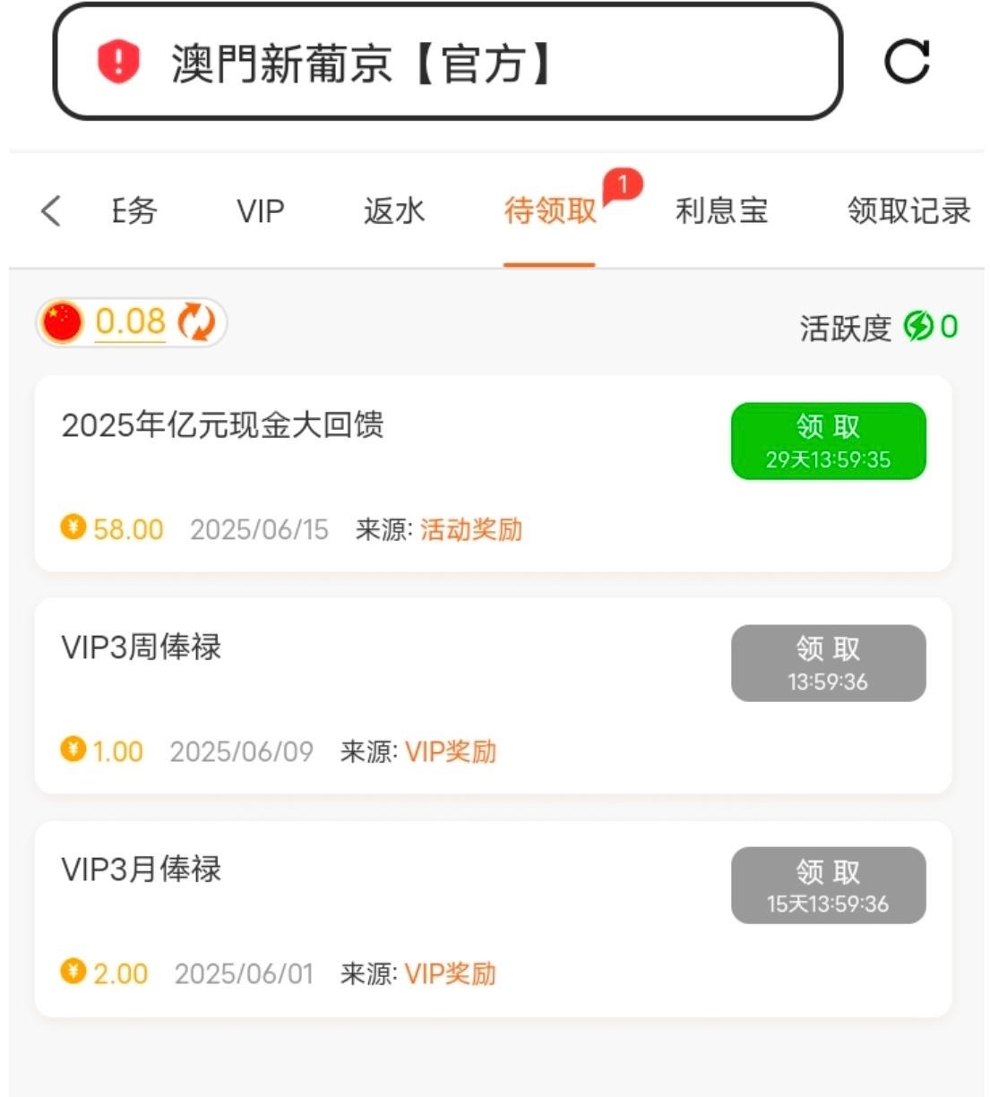 每月15日会员日,一个月内有投注的别忘了上线领取,领了58,得吃1000。可惜4块钱赏金进的赏金没炸,要是炸了今天就回血了 1959.com