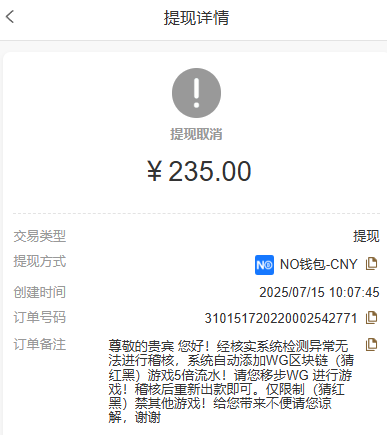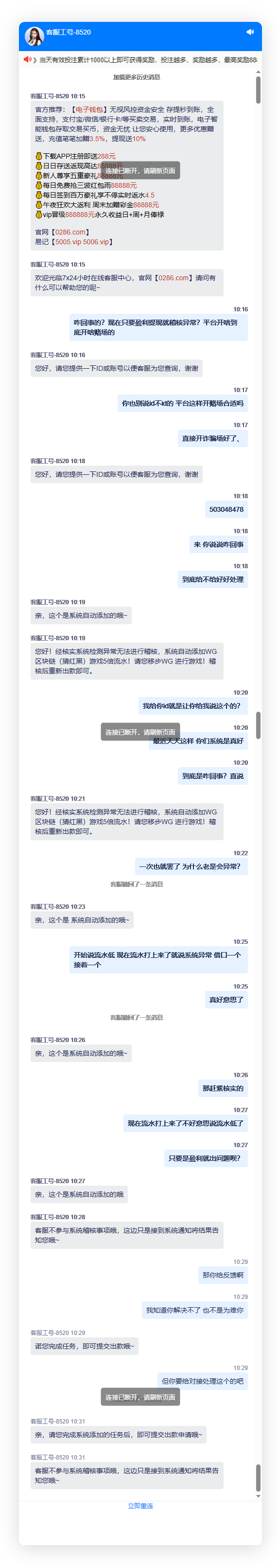 在0286新葡京只玩电子麻将,起初罚水说是流水低,现在流水打上来了又找其他借口,反正只要你提现就给你出问题,这和诈骗有啥区别?这回我是真不敢在0286新葡京诈骗台玩了,有在0286新葡京玩的老哥们都醒醒吧