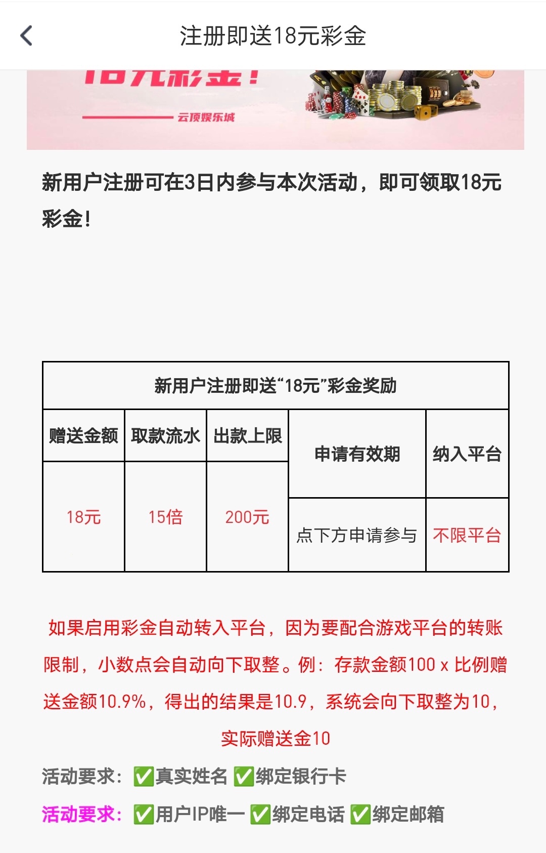 活动:新用户注册绑卡绑定手机号/邮箱地址优惠大厅自助领取18彩金