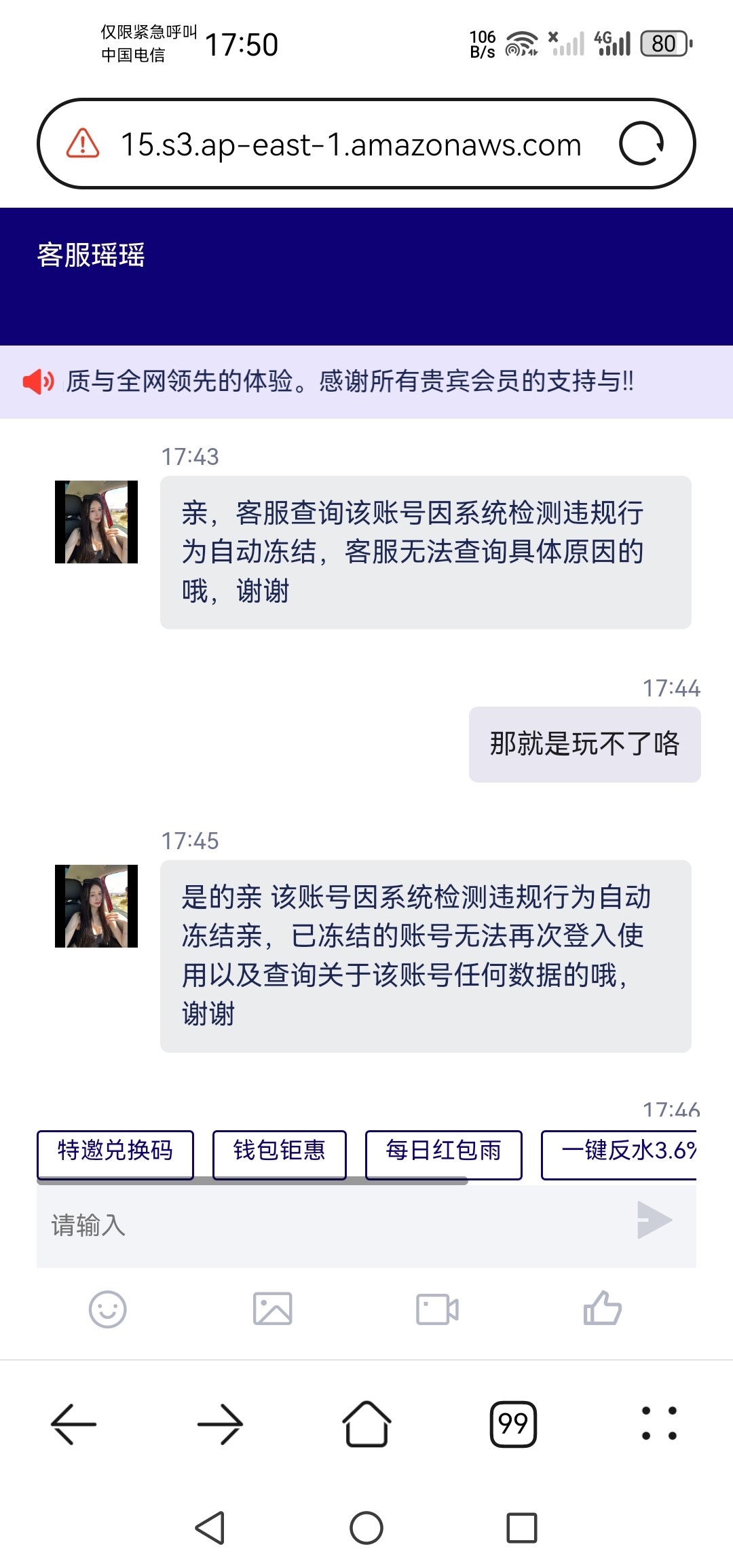 这个一直都发短信来,一看就黑,还打电话让我充值100送200,哪家好台100送200的