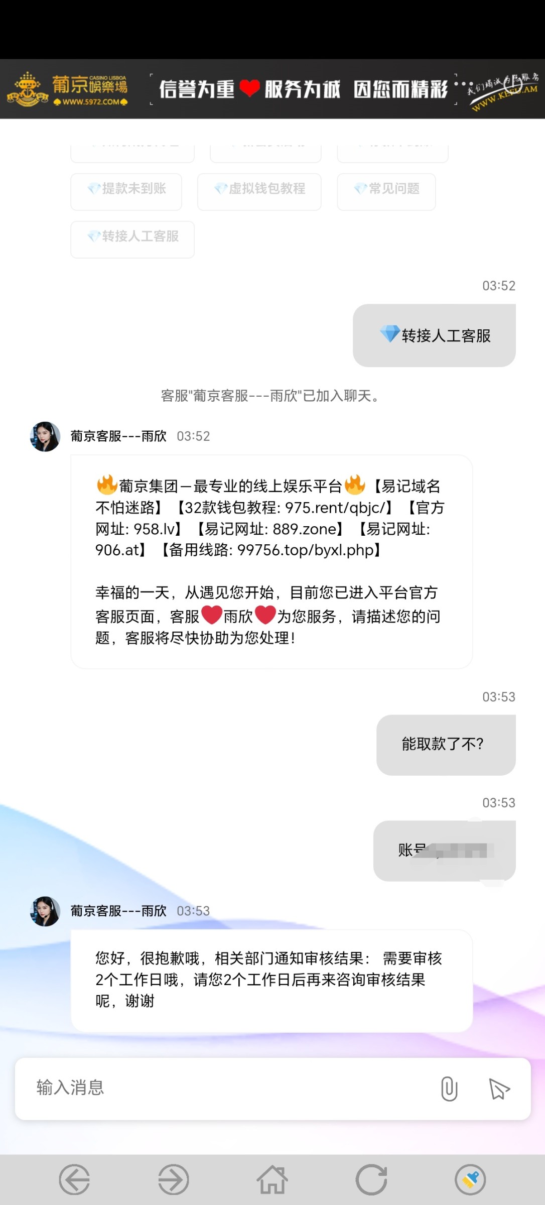 在论坛上看到这个台子链接,就跑去注册一个账号,冲了100没参加任何优惠,然后就打,一不小心爆了1.3 w,然后出款就不让出了,一气之下200多一下,爆到我3w多,返回去100都不让出。这种台子以后就远离吧,大家擦亮眼睛。