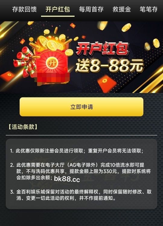 新用户下载APP注册绑卡(注意绑卡要接电话)点优惠开户红包领取送8/88,10倍流水最低提现100。