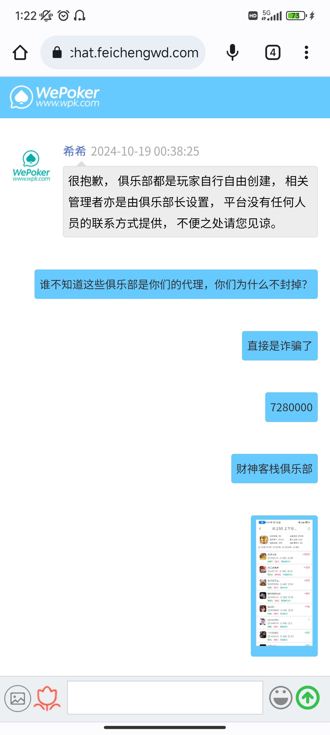 被wpk俱乐部财神客栈7280000(之前叫豪门俱乐部)黑了4200,起因是有个狗推加我微信说冲200送100,一顿操作打到4200去提现,结果直接黑掉。我贪它的100彩金,它贪的是我200本金,喜欢打德州扑克的老哥们避雷。狗庄玩不起了直接搞起了诈骗。还好只是损失200本金